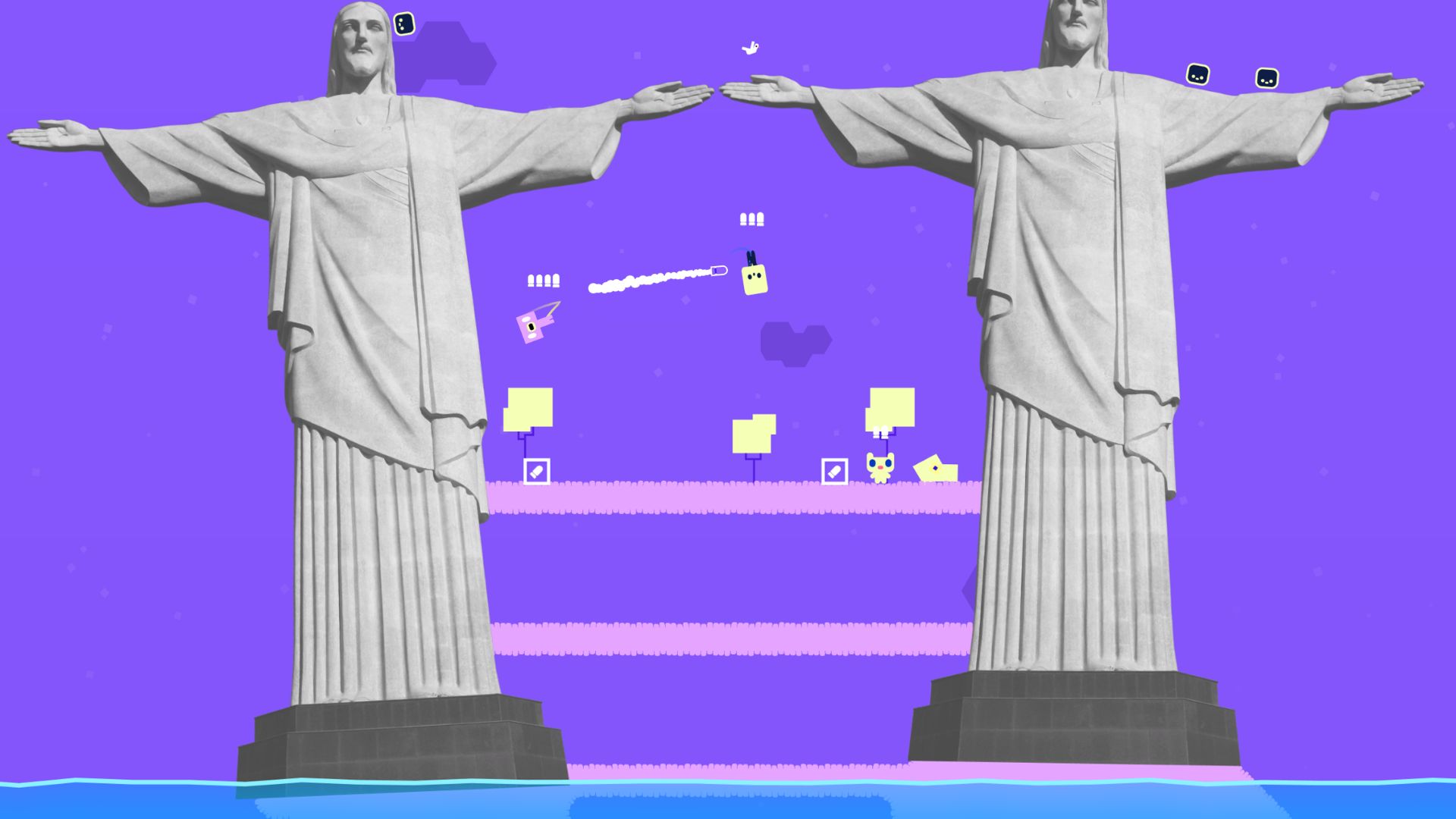 Influences: Duck Game (lobby mechanics and lighthearted competition), Towerfall (tight rounds and refined mechanics), Boomerang Fu (solid UX and screen flow), Super Smash Bros (real-time combat), Worms (artillery gameplay)